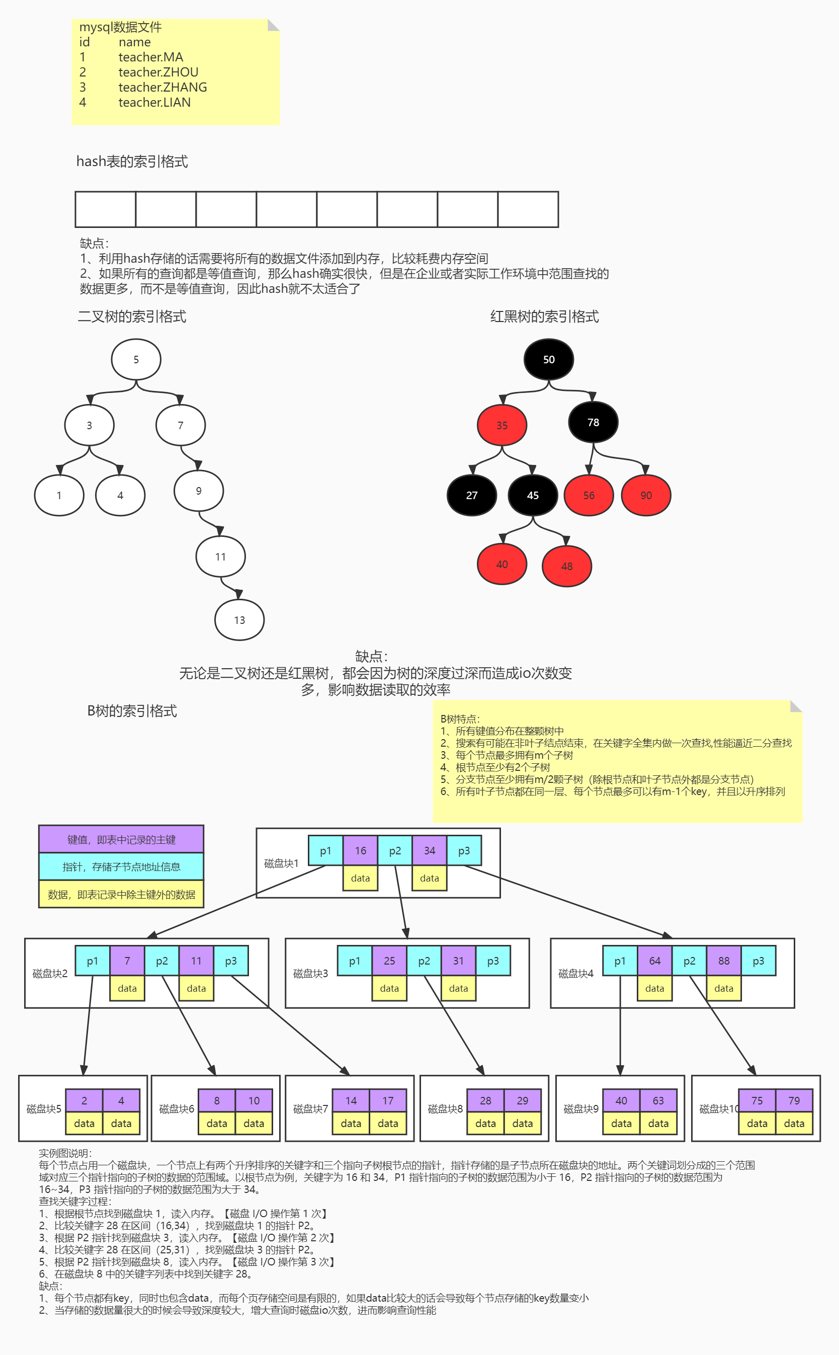 这种分开和放在一起存放方式就决定了最终我们在查找数据节点的查找方式是不一样的